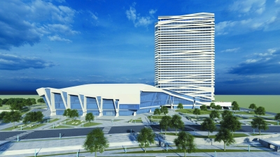 该项目占地面积约131亩,总建筑面积为18.72万平方米,建筑功能分为多功能厅、会议宴会厅、酒店及办公裙楼。其中,酒店共33层157米高,单层多功能厅高24米,两层(局部三层)会议宴会厅高36米。工程于2019年6月28日开工,到今天整整一年时间。目前,多功能厅和会议宴会厅已完成主体钢结构吊装,接下来进入金属屋面和外幕墙施工。