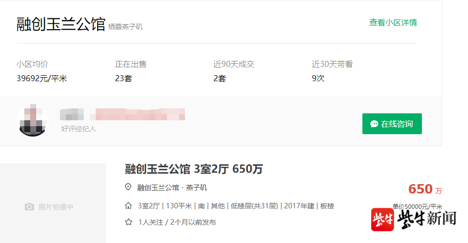 扬子晚报记者也在链家网上发现,融创玉兰公馆的当前均价为39692元/㎡,而在其成交记录上显示,5月份卖出的1套101平方米的户型,成交价为374万元,单价为36822元/㎡;今年3月,1套88平方米房源的成交价为295万,单价只有33527元/㎡。而在其最新上传的房源中,有房主报价甚至达到50000元/㎡,以44000元/㎡左右的挂牌价居多。在隔壁的几个小区中,房主报价也有所上扬,一街之隔的保利国际社区当前均价为33134元/㎡,而房主的最新挂牌价都在35000元/㎡往上跑,最贵的已经接近40000元/㎡;弘阳燕江府的报价也在33000元-38000元/㎡左右。